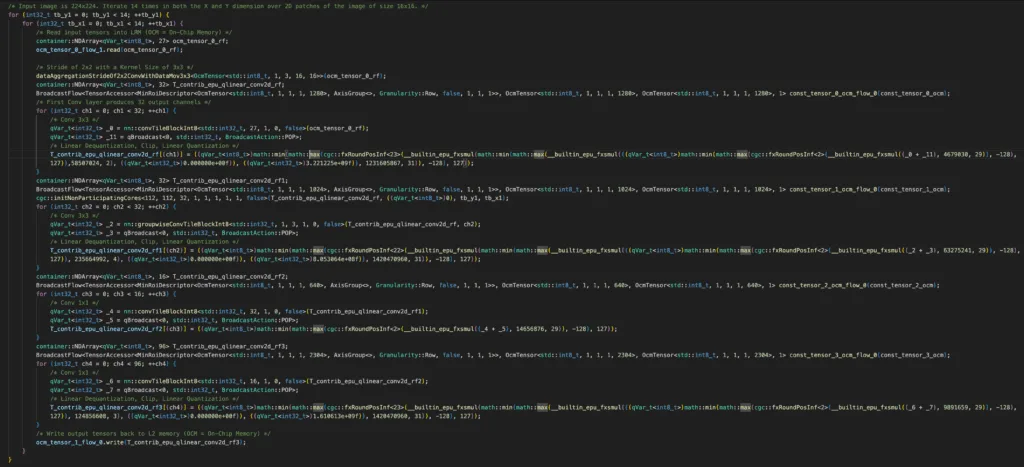 Since the PEs are collectively programmed with a single instruction stream, the APIs available to represent these operators are remarkably simple which can result in very short, but performant code. Below is the auto-generated C++ code-snippet for the MobileNetV2 operators from Figure 10 generated by Quadric’s CGC. Without comments, which have been added, it is 37 lines of code for all 17 operators: